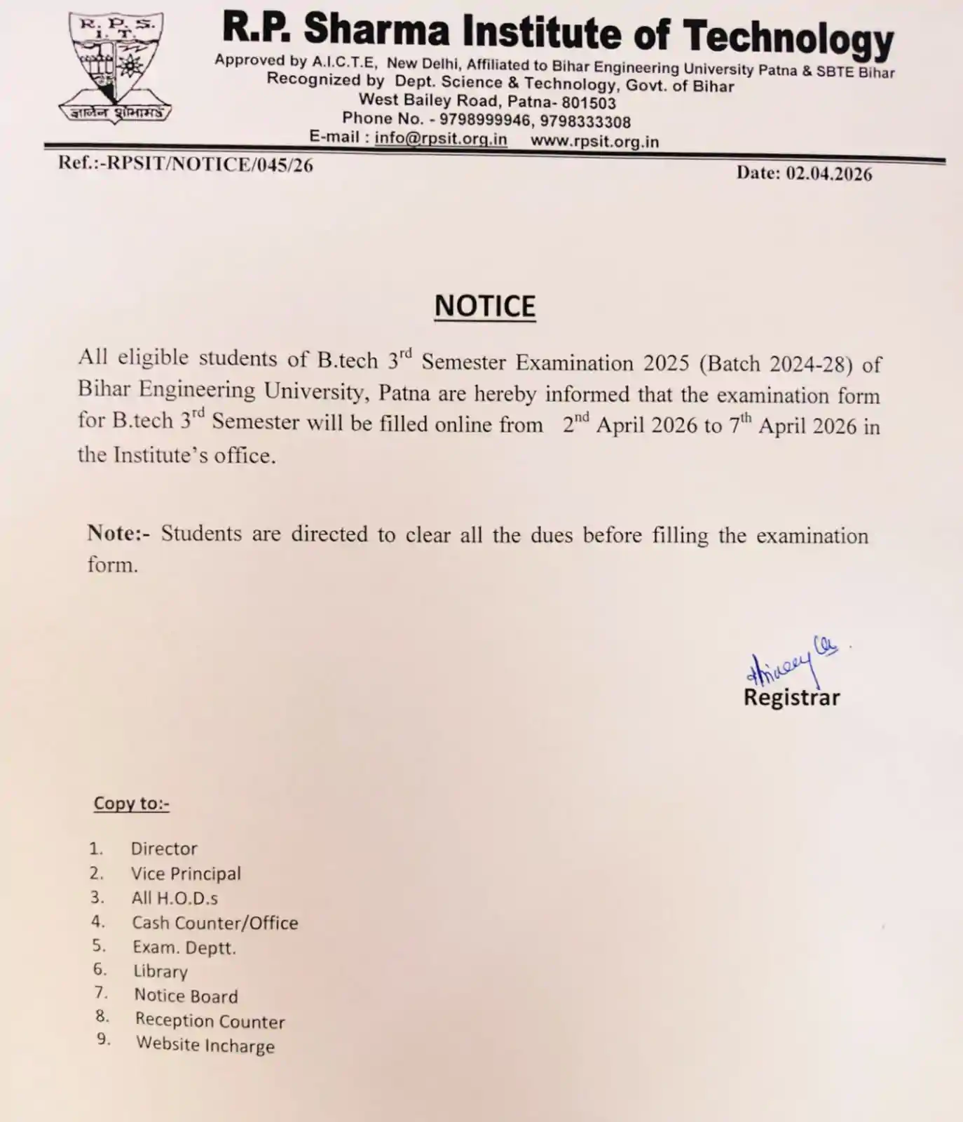 RPSIT is duly recognized by Department of Science & Technology Bihar and is Approved by the All India Council of Technical Education, New Delhi and is affiliated to Bihar Engineering University Patna and State Board of Technical Education, Bihar.